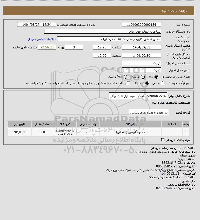 تلفن:5- 88349670 (021) فکس: 88349673 (021) Website: www.ParsNamadData.com E-mail: Info@ParsNamadData.com استعلام Albumin 22% - تعدادد مورد نیاز 1500ویال