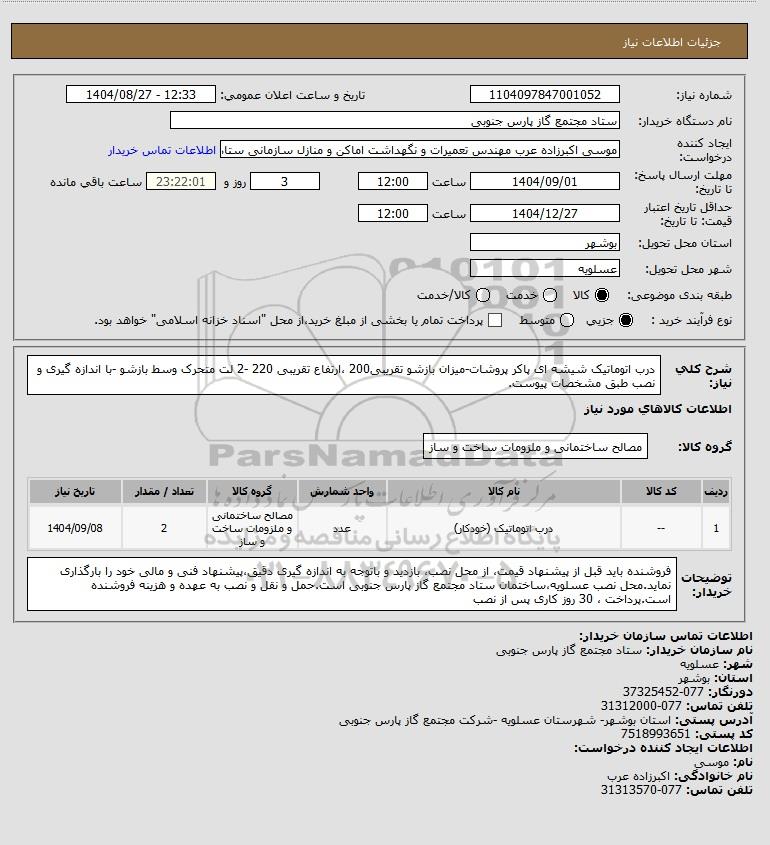 تلفن:5- 88349670 (021) فکس: 88349673 (021) Website: www.ParsNamadData.com E-mail: Info@ParsNamadData.com استعلام درب اتوماتیک شیشه ای پاکر پروشات-میزان بازشو تقریبی200 ارتفاع تقریبی 220 -2 لت متحرک وسط بازشو -با اندازه گیری و نصب طبق مشخصات پیوست.