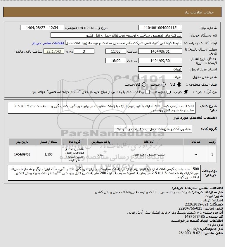 تلفن:5- 88349670 (021) فکس: 88349673 (021) Website: www.ParsNamadData.com E-mail: Info@ParsNamadData.com استعلام 1500 عدد پلمپ کیس های اداری با آلومینیوم آلیاژی یا زاماک مقاومت در برابر خوردگی کشیدگی و ... به ضخامت 1.5 تا 2.5 میلیمتر به شرح فایل پیوستی