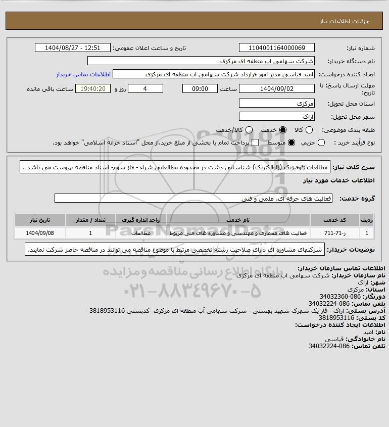 تلفن:5- 88349670 (021) فکس: 88349673 (021) Website: www.ParsNamadData.com E-mail: Info@ParsNamadData.com استعلام مطالعات ژئوفیزیک (ژئوالکتریک) شناسایی دشت در محدوده مطالعاتی شراء - فاز سوم- اسناد مناقصه بپیوست می باشد .