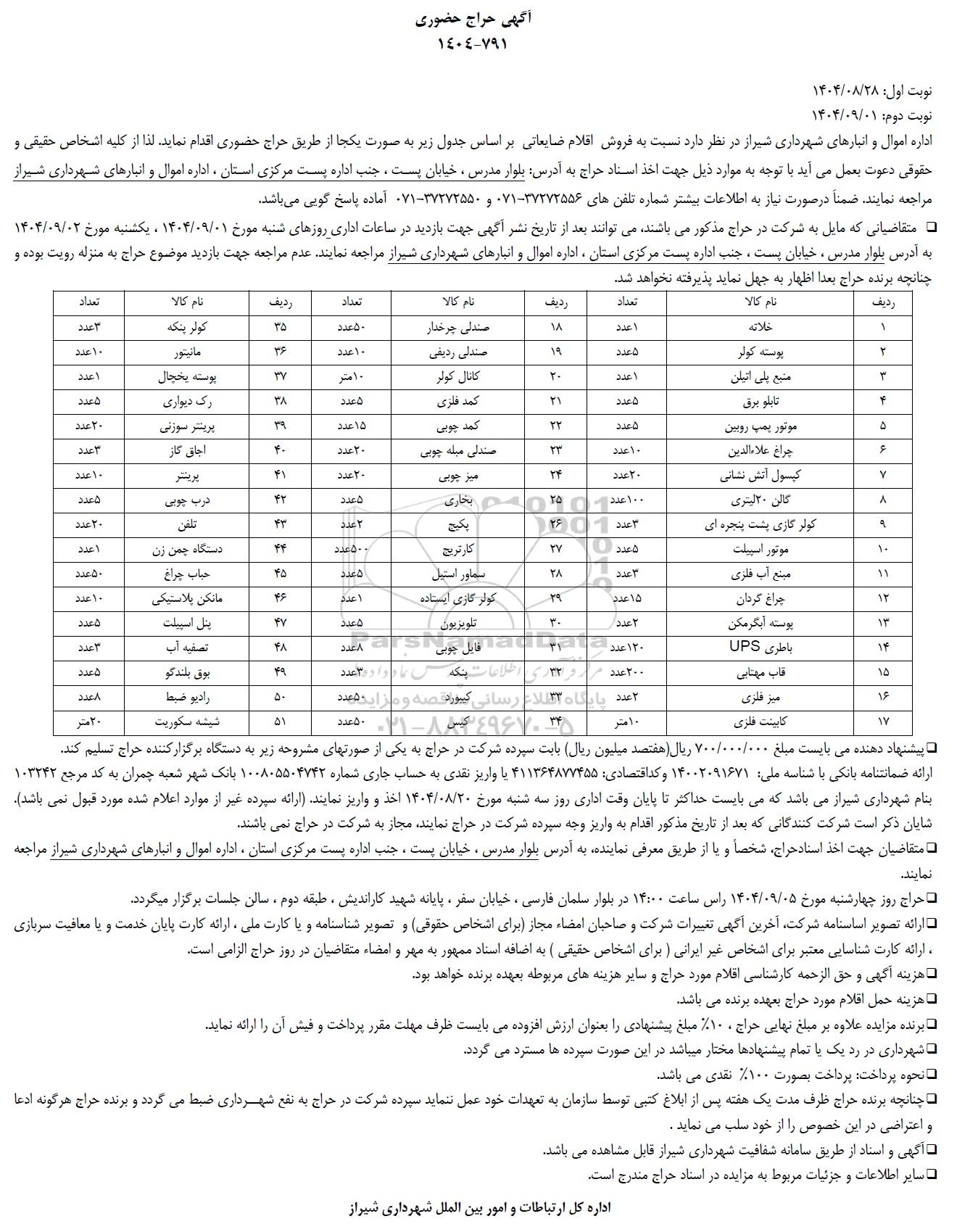 اداره اموال و انبارهای شهرداری شیراز در نظر دارد نسبت به فروش اقلام ضایعاتی بر اساس جدول زیر به صورت یکجا از طریق حراج حضوری اقدام نماید. لذا از کلیه اشخاص حقیقی و حقوقی دعوت بعمل می آید با توجه به موارد ذیل جهت اخذ اسناد حراج به آدرس بلوار مدرس ، خیابان پست ، جنب اداره پست مرکزی استان، اداره اموال و انبارهای شهرداری شیراز مراجعه نمایند. ضمنا در صورت نیاز به اطلاعات بیشتر شماره تلفنهای 37272556 -071 و 37272550 -071 آماده پاسخ گویی میباشد.