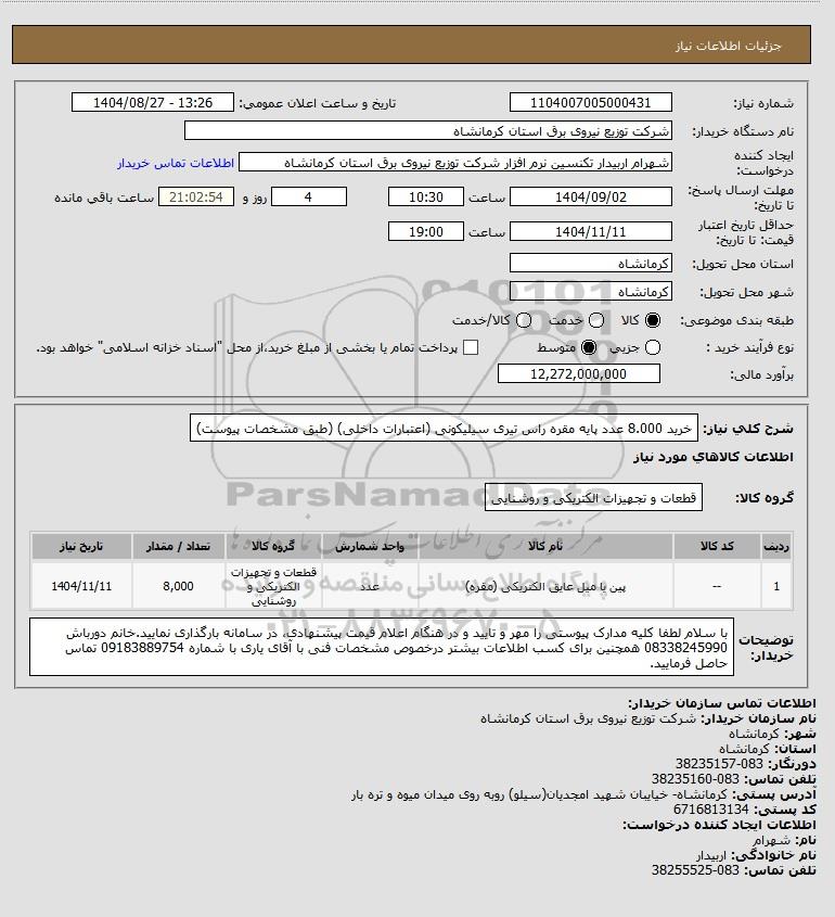 تلفن:5- 88349670 (021) فکس: 88349673 (021) Website: www.ParsNamadData.com E-mail: Info@ParsNamadData.com استعلام خرید 8.000 عدد پایه مقره راس تیری سیلیکونی (اعتبارات داخلی) (طبق مشخصات پیوست)