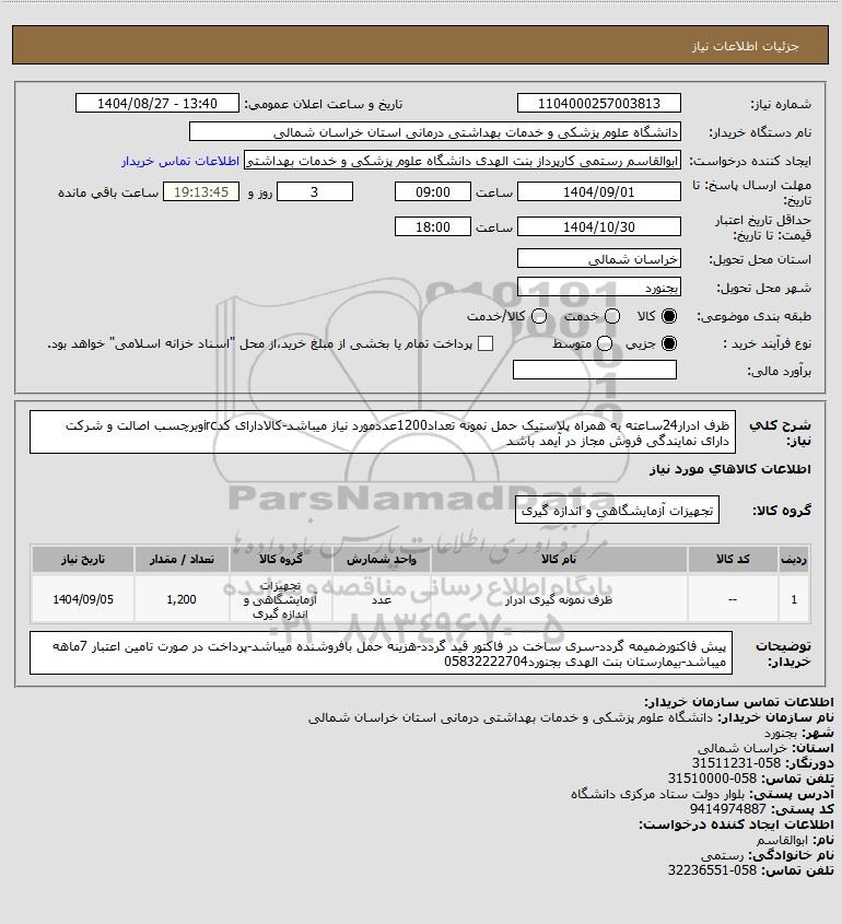 تلفن:5- 88349670 (021) فکس: 88349673 (021) Website: www.ParsNamadData.com E-mail: Info@ParsNamadData.com استعلام ظرف ادرار24ساعته به همراه پلاستیک حمل نمونه تعداد1200عددمورد نیاز میباشد-کالادارای کدircوبرچسب اصالت و شرکت دارای نمایندگی فروش مجاز در آیمد باشد