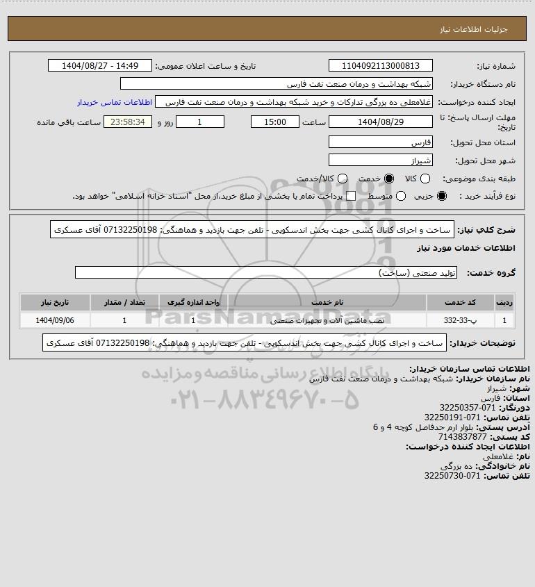 تلفن:5- 88349670 (021) فکس: 88349673 (021) Website: www.ParsNamadData.com E-mail: Info@ParsNamadData.com استعلام ساخت و اجرای کانال کشی جهت بخش اندسکوپی - تلفن جهت بازدید و هماهنگی: 07132250198 آقای عسکری