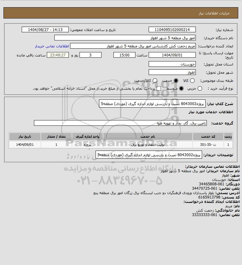 تلفن:5- 88349670 (021) فکس: 88349673 (021) Website: www.ParsNamadData.com E-mail: Info@ParsNamadData.com استعلام پروژه8043002 تست و بازرسی لوازم اندازه گیری (موردی) منطقه5