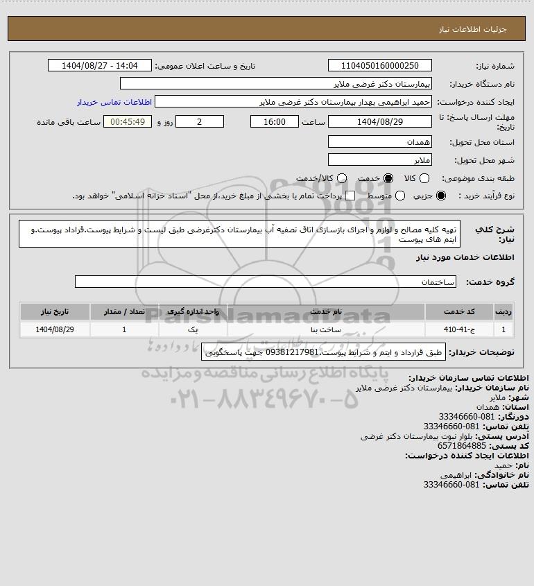 تلفن:5- 88349670 (021) فکس: 88349673 (021) Website: www.ParsNamadData.com E-mail: Info@ParsNamadData.com استعلام تهیه کلیه مصالح و لوازم و اجرای بازسازی اتاق تصفیه آب بیمارستان دکترغرضی طبق لیست و شرایط پیوست.قراداد پیوست.و ایتم های پیوست