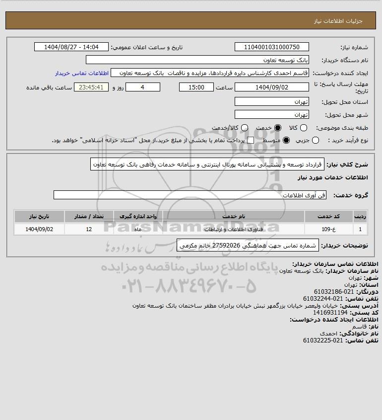 تلفن:5- 88349670 (021) فکس: 88349673 (021) Website: www.ParsNamadData.com E-mail: Info@ParsNamadData.com استعلام قرارداد توسعه و پشتیبانی سامانه پورتال اینترنتی و سامانه خدمات رفاهی بانک توسعه تعاون