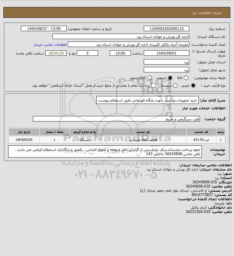 تلفن:5- 88349670 (021) فکس: 88349673 (021) Website: www.ParsNamadData.com E-mail: Info@ParsNamadData.com استعلام خرید تجهیزات ورزشی جهت پایگاه قهرمانی طبق استعلام پیوست