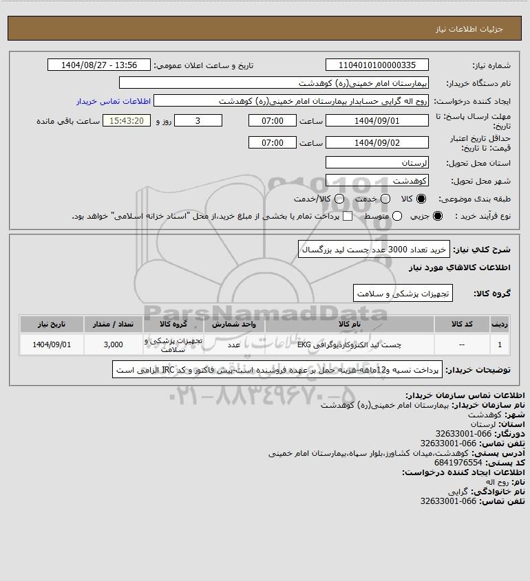 تلفن:5- 88349670 (021) فکس: 88349673 (021) Website: www.ParsNamadData.com E-mail: Info@ParsNamadData.com استعلام خرید تعداد 3000 عدد چست لید بزرگسال