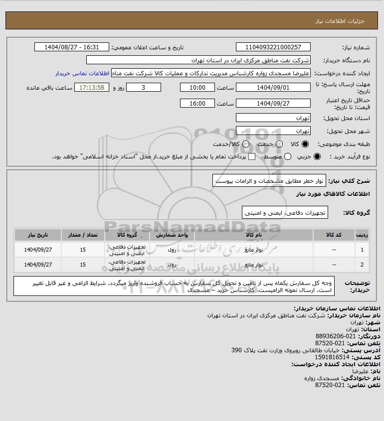 تلفن:5- 88349670 (021) فکس: 88349673 (021) Website: www.ParsNamadData.com E-mail: Info@ParsNamadData.com استعلام نوار خطر مطابق مشخصات و الزامات پیوست