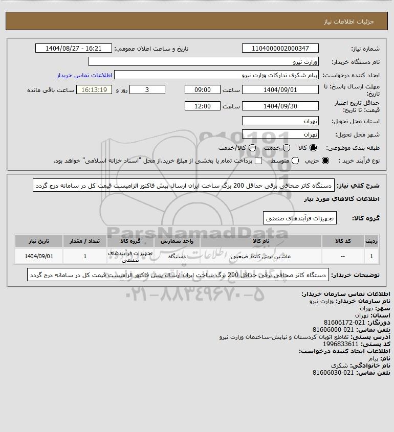 تلفن:5- 88349670 (021) فکس: 88349673 (021) Website: www.ParsNamadData.com E-mail: Info@ParsNamadData.com استعلام دستگاه کاتر صحافی برقی حداقل 200 برگ ساخت ایران ارسال پیش فاکتور الزامیست قیمت کل در سامانه درج گردد