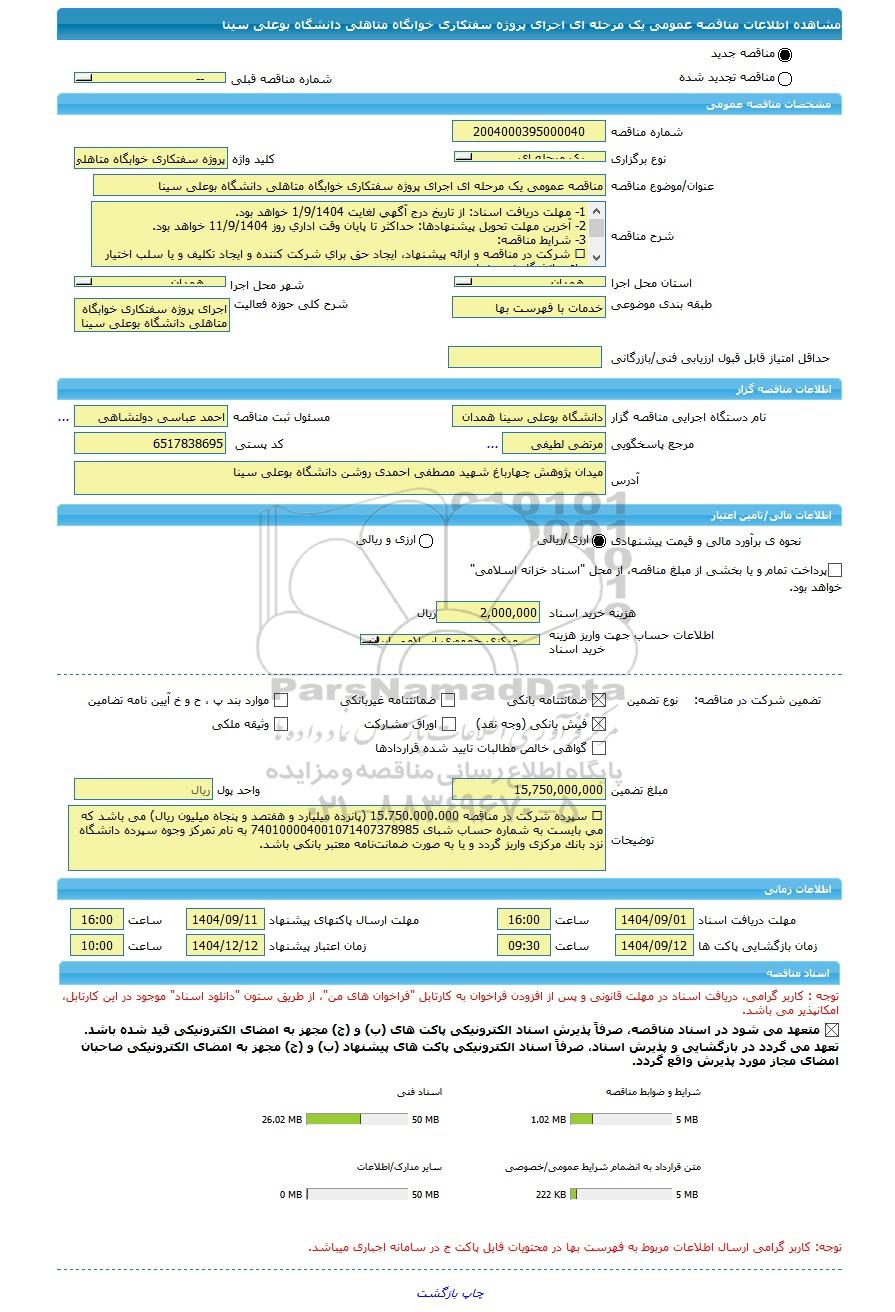 | عنوان آگهی: مناقصه مناقصه عمومی یک مرحله ای اجرای پروژه سفتکاری خوابگاه متاهلی دانشگاه بوعلی سینا |