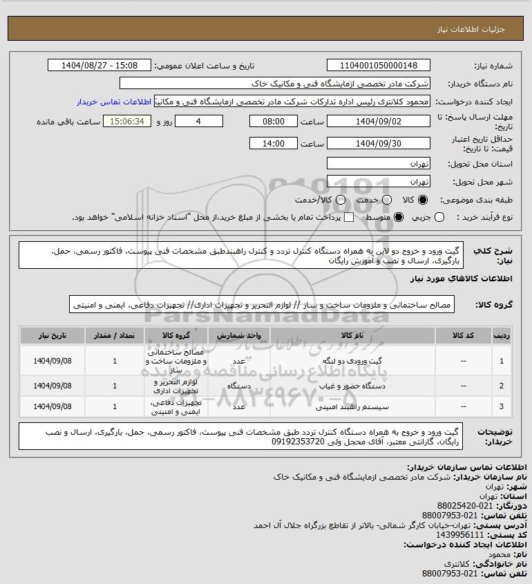 تلفن:5- 88349670 (021) فکس: 88349673 (021) Website: www.ParsNamadData.com E-mail: Info@ParsNamadData.com استعلام گیت ورود و خروج دو لاین به همراه دستگاه کنترل تردد و کنترل راهبندطبق مشخصات فنی پیوست فاکتور رسمی حمل بارگیری ارسال و نصب و آموزش رایگان