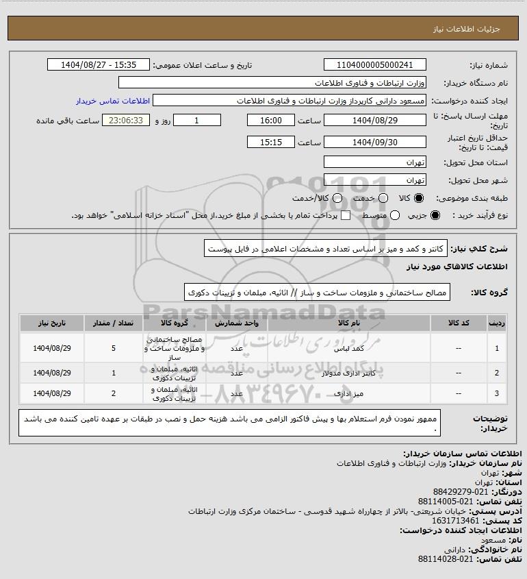 تلفن:5- 88349670 (021) فکس: 88349673 (021) Website: www.ParsNamadData.com E-mail: Info@ParsNamadData.com استعلام کانتر و کمد و میز بر اساس تعداد و مشخصات اعلامی در فایل پیوست