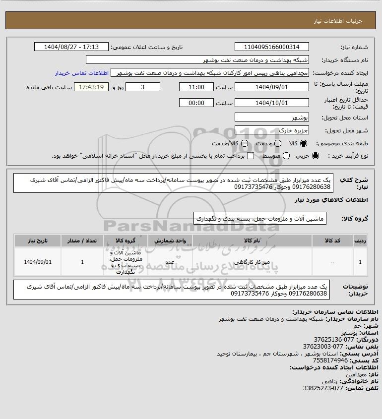 تلفن:5- 88349670 (021) فکس: 88349673 (021) Website: www.ParsNamadData.com E-mail: Info@ParsNamadData.com استعلام یک عدد میزابزار طبق مشخصات ثبت شده در تصویر پیوست سامانه/پرداخت سه ماه/پیش فاکتور الزامی/تماس آقای شیری 09176280638 وجوکار 09173735476