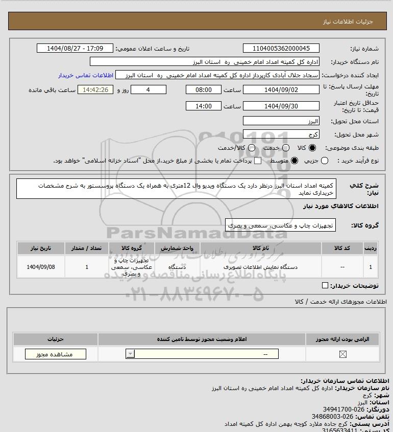 تلفن:5- 88349670 (021) فکس: 88349673 (021) Website: www.ParsNamadData.com E-mail: Info@ParsNamadData.com استعلام کمیته امداد استان البرز درنظر دارد یک دستگاه ویدیو وال 12متری به همراه یک دستگاه پروسستور به شرح مشخصات خریداری نماید