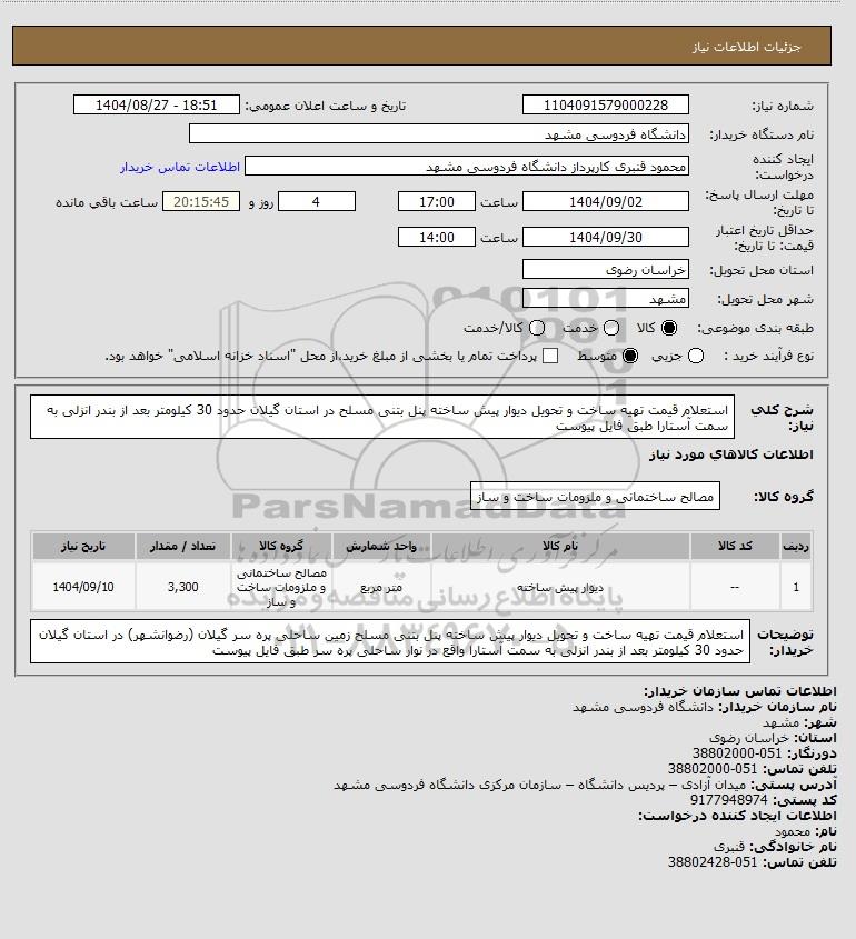 تلفن:5- 88349670 (021) فکس: 88349673 (021) Website: www.ParsNamadData.com E-mail: Info@ParsNamadData.com استعلام استعلام قیمت تهیه ساخت و تحویل دیوار پیش ساخته پنل بتنی مسلح در استان گیلان حدود 30 کیلومتر بعد از بندر انزلی به سمت آستارا طبق فایل پیوست