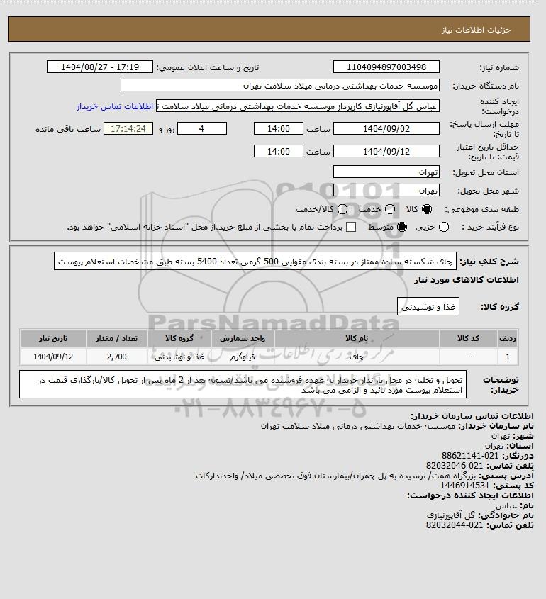 تلفن:5- 88349670 (021) فکس: 88349673 (021) Website: www.ParsNamadData.com E-mail: Info@ParsNamadData.com استعلام چای شکسته ساده ممتاز در بسته بندی مقوایی 500 گرمی تعداد 5400 بسته طبق مشخصات استعلام پیوست