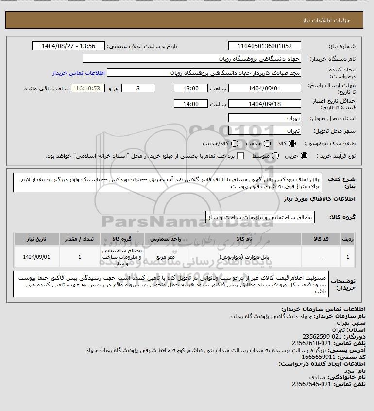 تلفن:5- 88349670 (021) فکس: 88349673 (021) Website: www.ParsNamadData.com E-mail: Info@ParsNamadData.com استعلام پانل نمای بوردکس پانل گچی مسلح با الیاف فایبر گلاس ضد آب وحریق ---بتونه بوردکس ---ماستیک ونوار درزگیر به مقدار لازم برای متراژ فوق به شرح دقیق پیوست