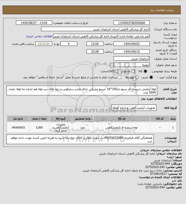 تلفن:5- 88349670 (021) فکس: 88349673 (021) Website: www.ParsNamadData.com E-mail: Info@ParsNamadData.com استعلام لوله آزمایش شیشه ای درپیچ دار100*16 -درپیچ مشکی دارای واشر سلیکونی و رزوه های سر لوله هم اندازه تنه لوله- تعداد 5000 عدد