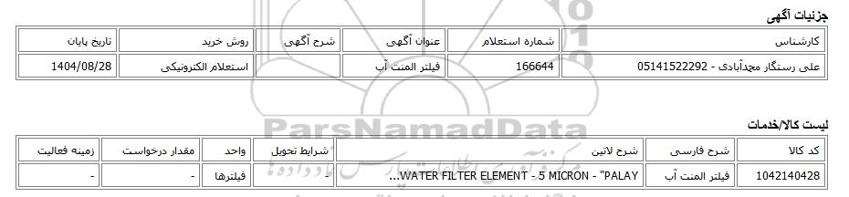 عنوان آگهی: استعلام الکترونیکی فیلتر المنت آب