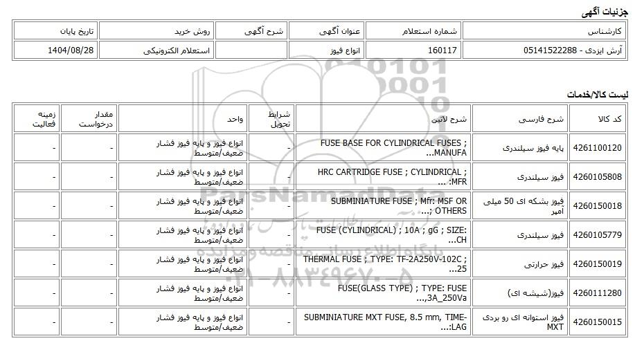 عنوان آگهی: استعلام الکترونیکی انواع فیوز