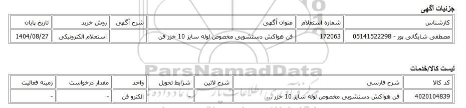 تلفن:5- 88349670 (021) فکس: 88349673 (021) Website: www.ParsNamadData.com E-mail: Info@ParsNamadData.com استعلام الکترونیکی فن هواکش دستشویی مخصوص لوله سایز 10 خزر فن