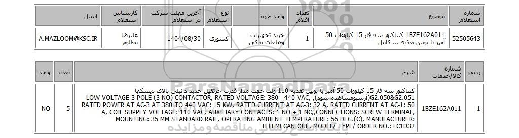 تلفن:5- 88349670 (021) فکس: 88349673 (021) Website: www.ParsNamadData.com E-mail: Info@ParsNamadData.com استعلام 1BZE162A011 کنتاکتور سه فاز 15 کیلووات 50 آمپر با بوبین تغذیه ... کامل