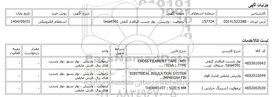 تلفن:5- 88349670 (021) فکس: 88349673 (021) Website: www.ParsNamadData.com E-mail: Info@ParsNamadData.com استعلام الکترونیکی ترموفیت وارنیش نوار چسب الیافدار کنفی tesa4591