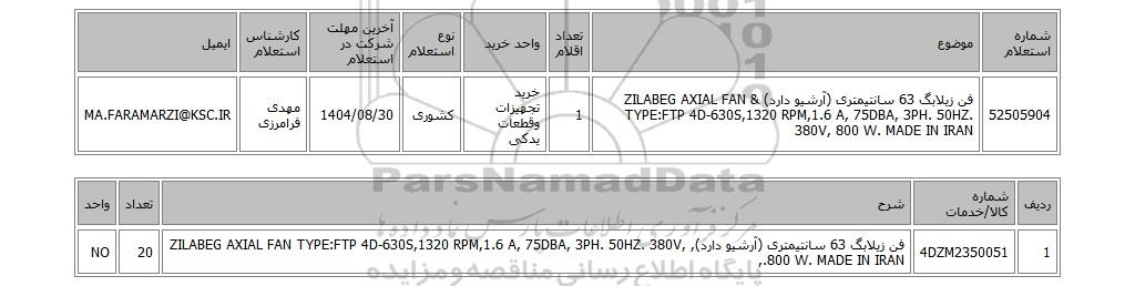 عنوان آگهی: استعلام فن زیلابگ 63 سانتیمتری (آرشیو دارد) & ZILABEG AXIAL FAN TYPE:FTP 4D-630S1320 RPM1.6 A 75DBA 3PH. 50HZ. 380V 800 W. MADE IN IRAN