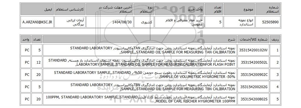 STANDARD LABORATORY SAMPLE,,STANDARD OIL SAMPLE FOR MEASURING TBN CALIBRATION, | 5 | PC | | 5 | 353154200802S | نمونه استاندارد آزمایشگاه,,نمونه استاندارد رطوبت سنج کارل فیشر100PPM,