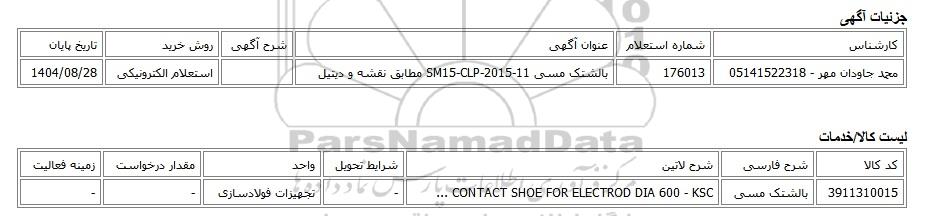 تلفن:5- 88349670 (021) فکس: 88349673 (021) Website: www.ParsNamadData.com E-mail: Info@ParsNamadData.com استعلام الکترونیکی بالشتک مسی SM15-CLP-2015-11 مطابق نقشه و دیتیل