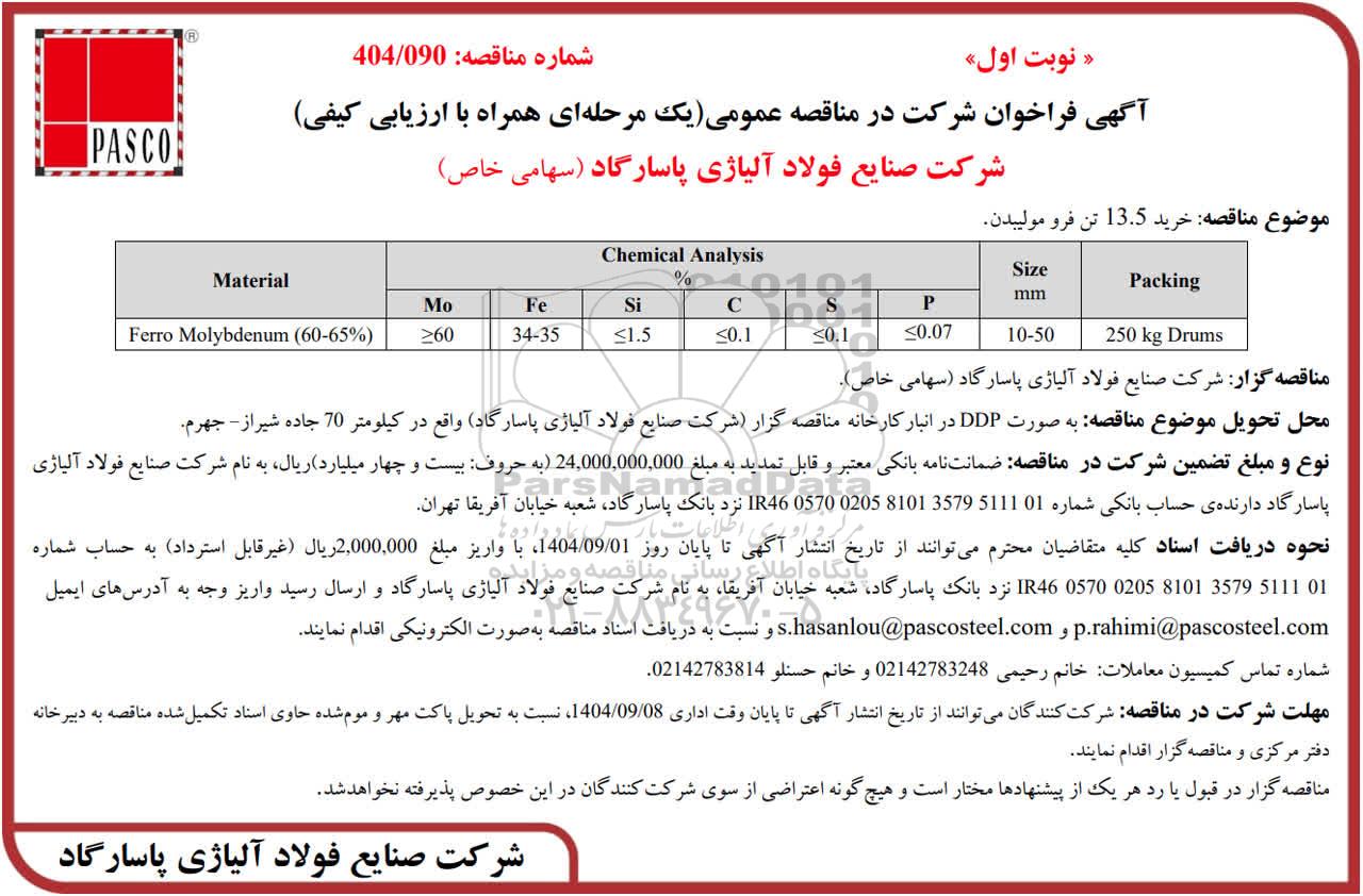 موضوع مناقصه: خرید 13.5 تن فرو مولیبدن