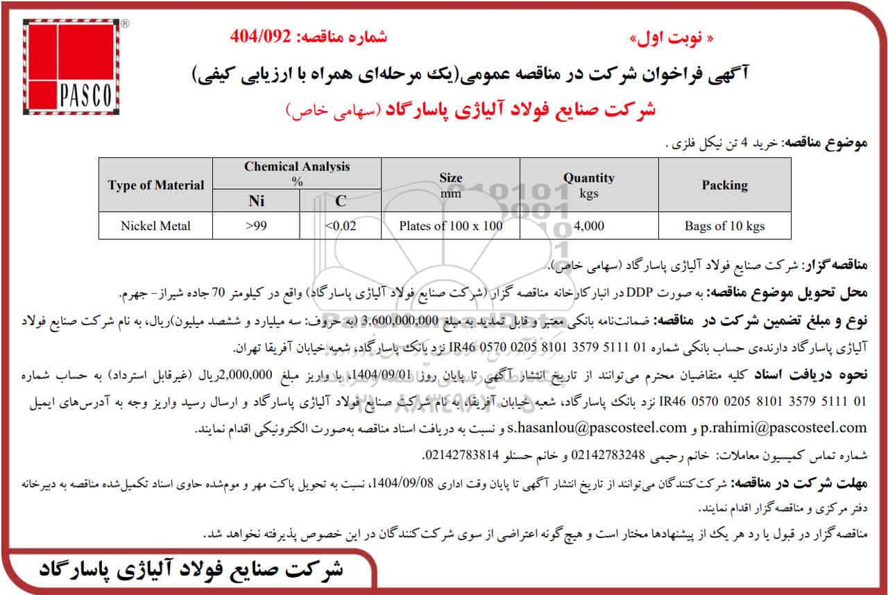 | عنوان آگهی: مناقصه عمومی خرید 4 تن نیکل فلزی |