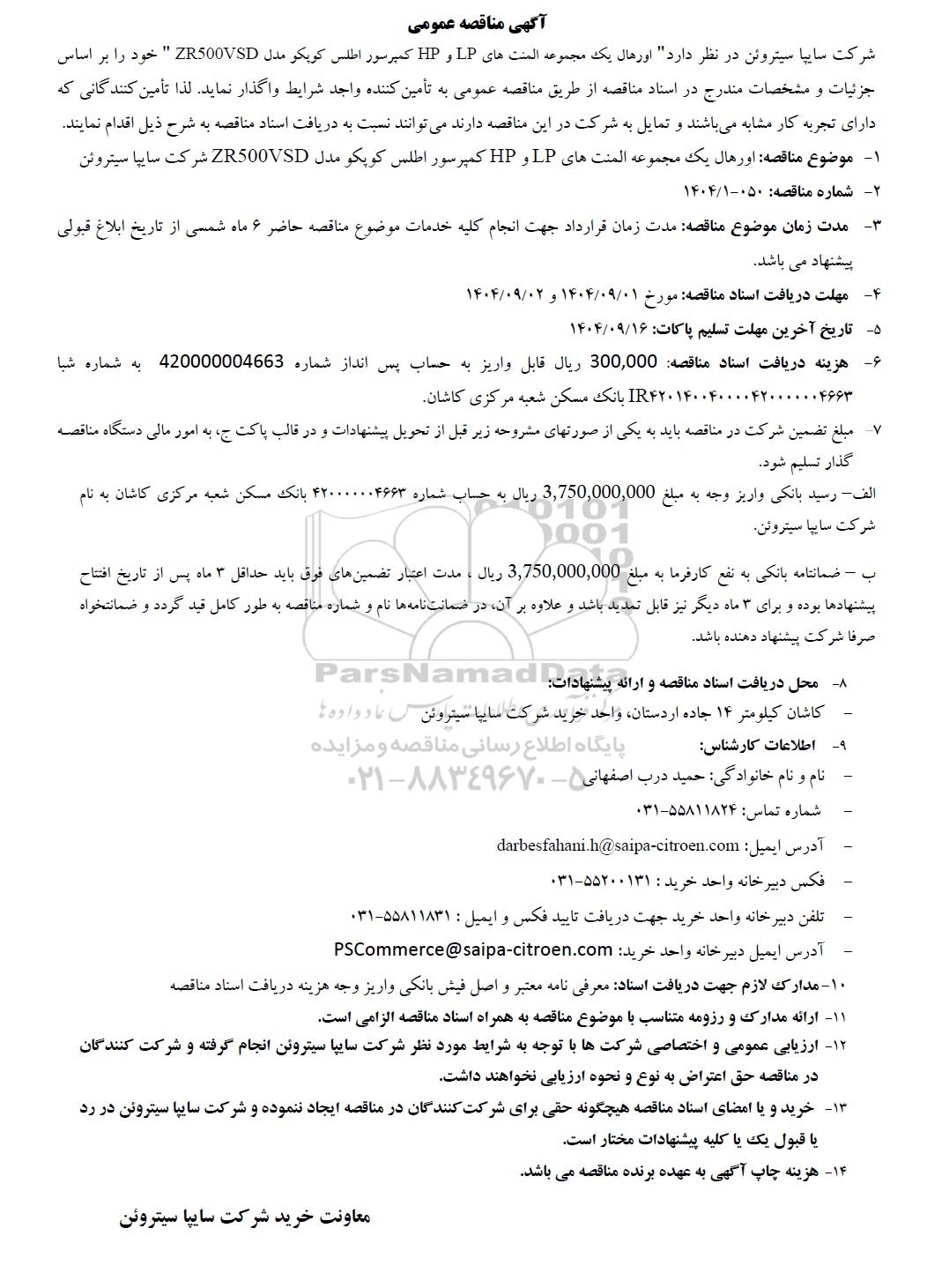 شرکت سایپا سیتروئن در نظر دارد "اورهال یک مجموعه المنت های LP و HP کمپرسور اطلس کویکو مدل ZR500VSD " خود را بر اساس جزئیات و مشخصات مندرج در اسناد مناقصه از طریق مناقصه عمومی به تأمین کننده واجد شرایط واگذار نماید. لذا تأمین کنندگانی که دارای تجربه کار مشابه می باشند و تمایل به شرکت در این مناقصه دارند می توانند نسبت به دریافت اسناد مناقصه به شرح ذیل اقدام نمایند.