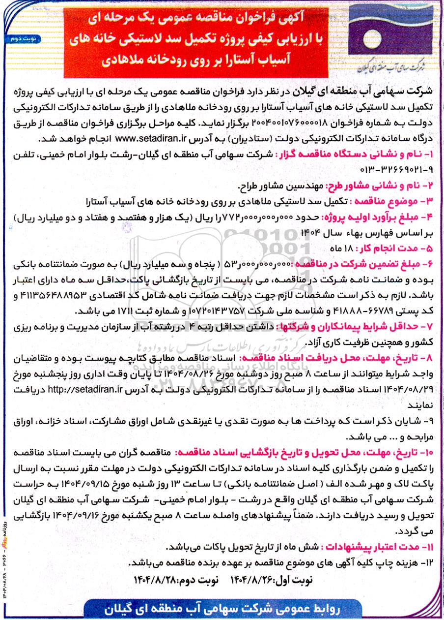 شرکت سهامی آب منطقه ای گیلان در نظر دارد فراخوان مناقصه عمومی یک مرحله ای با ارزیابی کیفی پروژه تکمیل سد لاستیکی خانه های آسیاب آستارا بر روی رودخانه ملاهادی را از طریق سامانه تدارکات الکترونیکی دولت به شماره فراخوان 2004001076000018 برگزار نماید. کلیه مراحل برگزاری فراخوان مناقصه از طریق درگاه سامانه تدارکات الکترونیکی دولت (ستاد ایران) انجام خواهد شد.