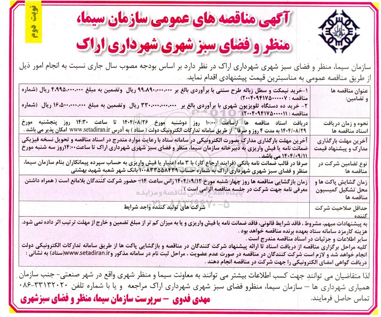 آگهی مناقصه های عمومی سازمان سیما، منظر و فضای سبز شهری شهرداری اراک ؟