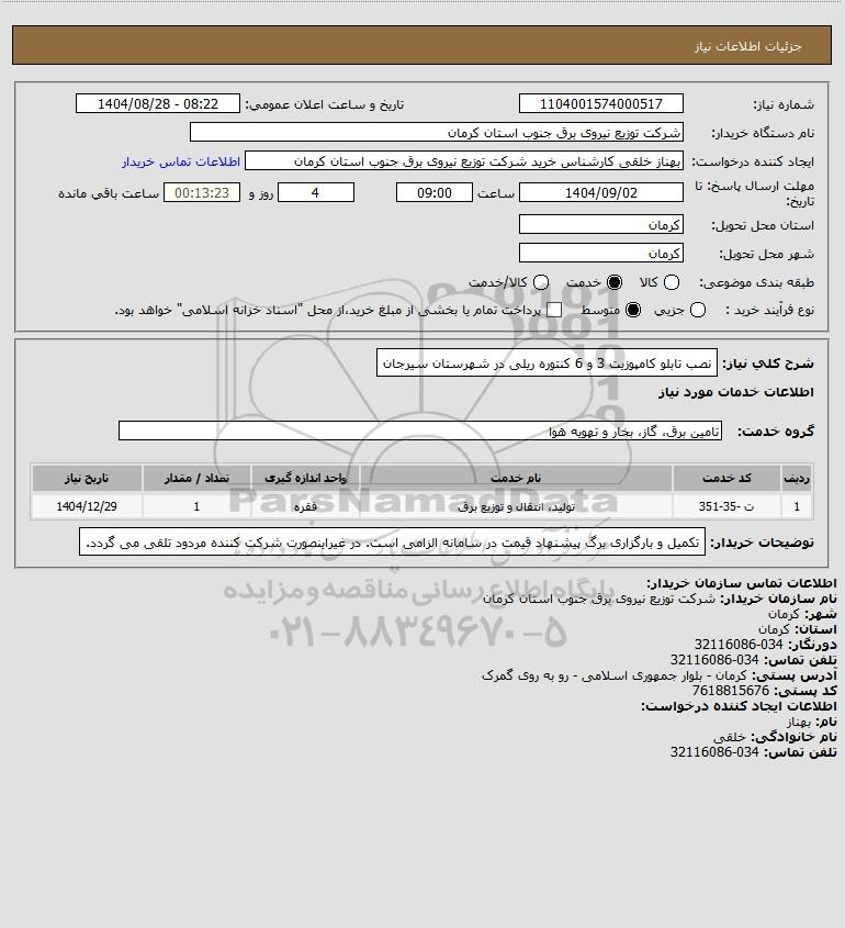 تلفن:5- 88349670 (021) فکس: 88349673 (021) Website: www.ParsNamadData.com E-mail: Info@ParsNamadData.com استعلام نصب تابلو کامپوزیت 3 و 6 کنتوره ریلی در شهرستان سیرجان