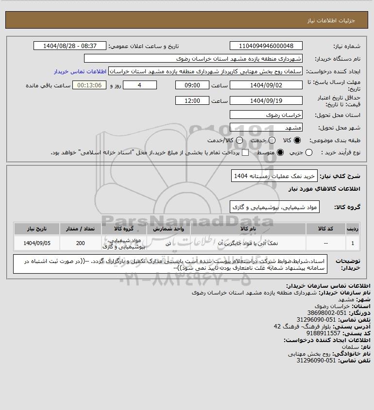 تلفن:5- 88349670 (021) فکس: 88349673 (021) Website: www.ParsNamadData.com E-mail: Info@ParsNamadData.com استعلام خرید نمک عملیات زمستانه 1404