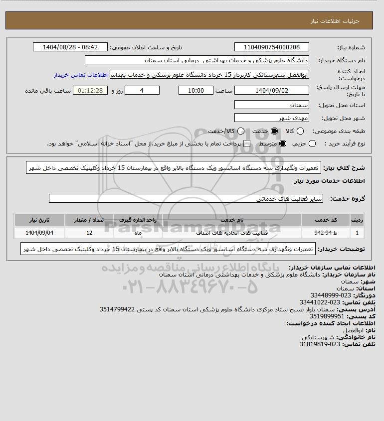 تلفن:5- 88349670 (021) فکس: 88349673 (021) Website: www.ParsNamadData.com E-mail: Info@ParsNamadData.com استعلام تعمیرات ونگهداری سه دستگاه اسانسور ویک دستگاه بالابر واقع در بیمارستان 15 خرداد وکلینیک تخصصی داخل شهر