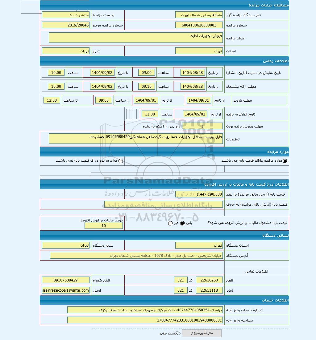 | عنوان آگهی: مزایده فروش تجهیزات اداری |