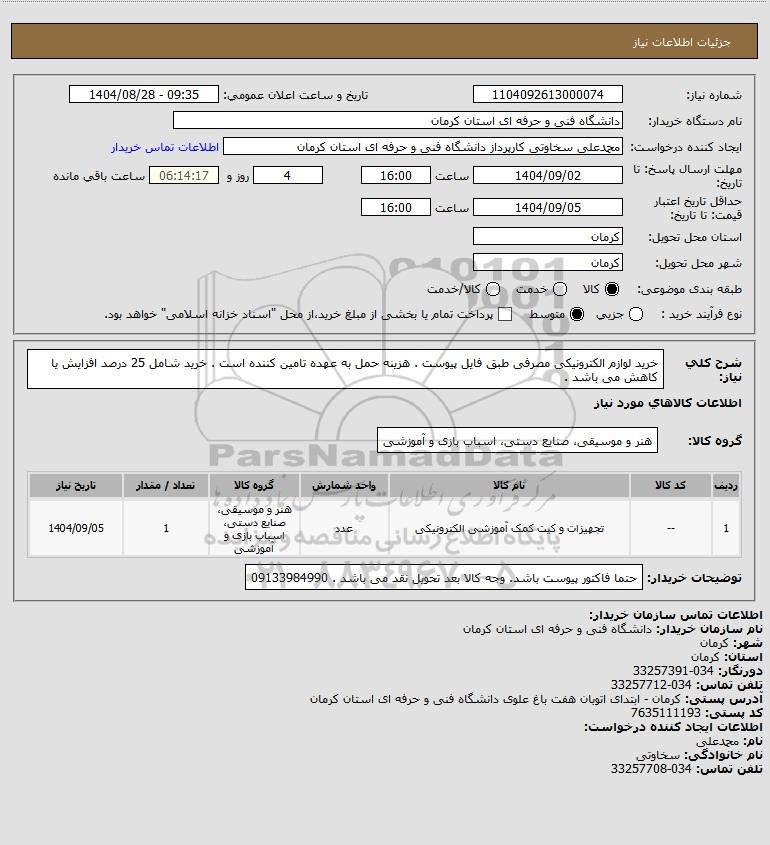 تلفن:5- 88349670 (021) فکس: 88349673 (021) Website: www.ParsNamadData.com E-mail: Info@ParsNamadData.com استعلام خرید لوازم الکترونیکی مصرفی طبق فایل پیوست . هزینه حمل به عهده تامین کننده است . خرید شامل 25 درصد افزایش یا کاهش می باشد .
