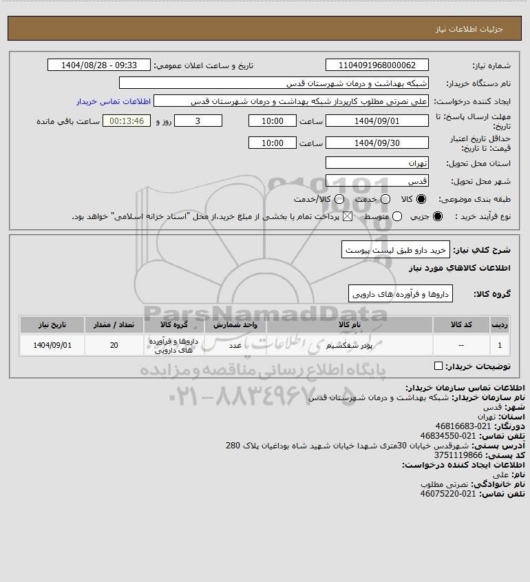 تلفن:5- 88349670 (021) فکس: 88349673 (021) Website: www.ParsNamadData.com E-mail: Info@ParsNamadData.com استعلام خرید دارو طبق لیست پیوست