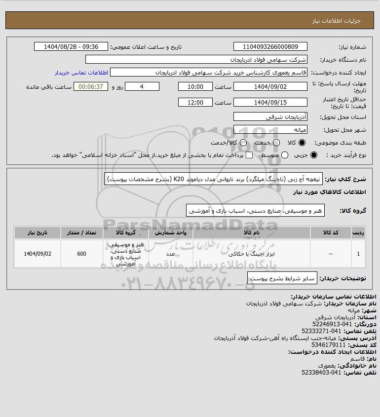 تلفن:5- 88349670 (021) فکس: 88349673 (021) Website: www.ParsNamadData.com E-mail: Info@ParsNamadData.com استعلام تیغچه آج زنی (ناچینگ میلگرد) برند تایوانی مدل دیاموند K20 (بشرح مشخصات پیوست)