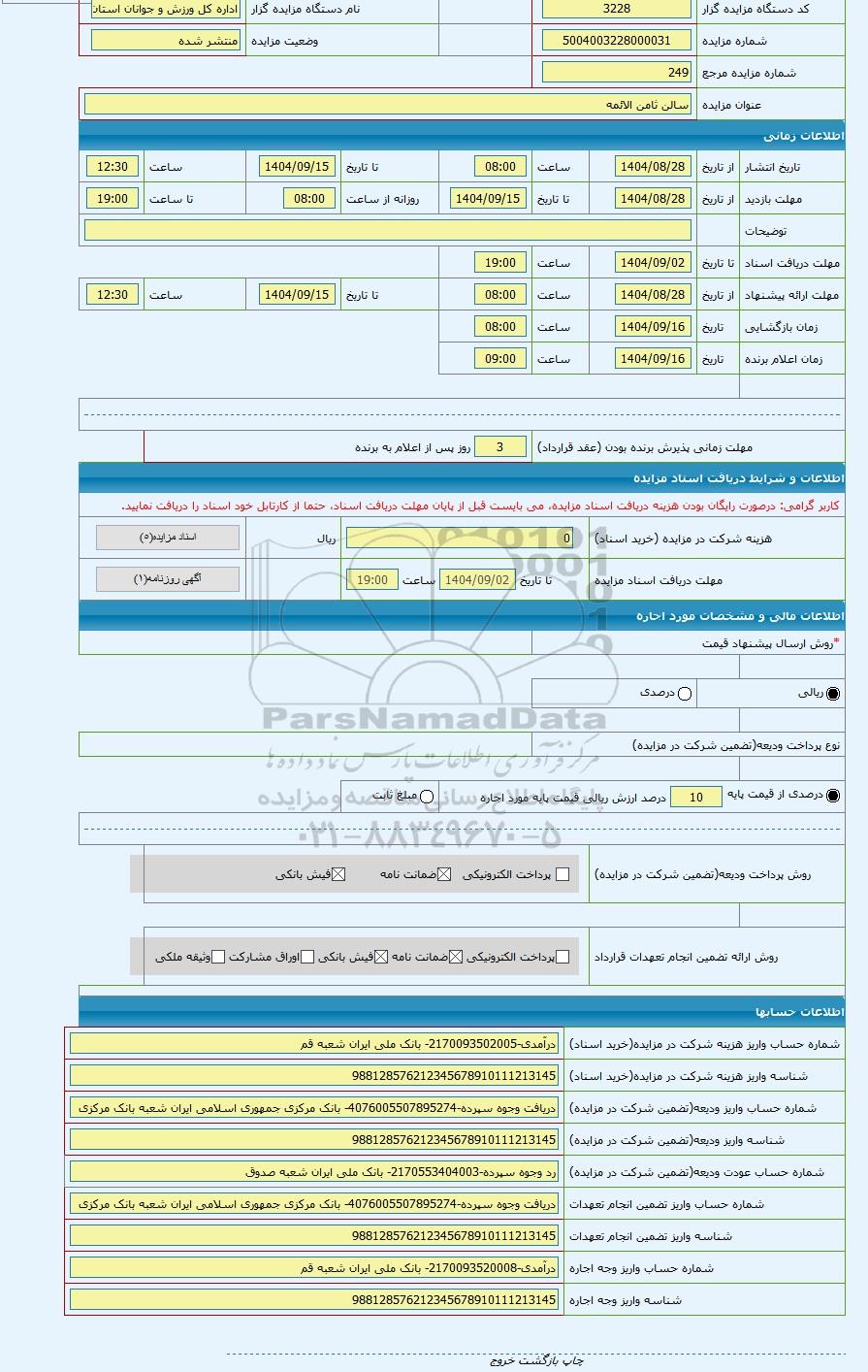 تلفن:5- 88349670 (021) فکس: 88349673 (021) Website: www.ParsNamadData.com E-mail: Info@ParsNamadData.com مزایده سالن ثامن الائمه