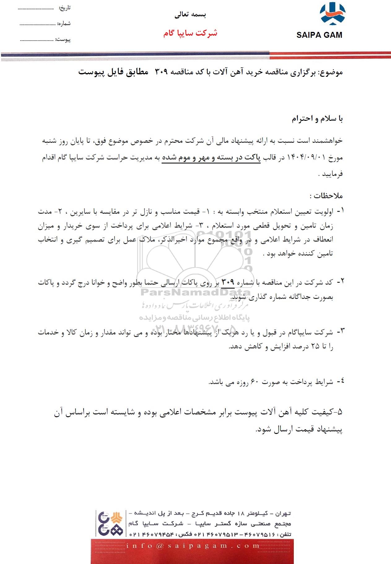 موضوع: برگزاری مناقصه خرید آهن آلات با کد مناقصه 309 مطابق فایل پیوست