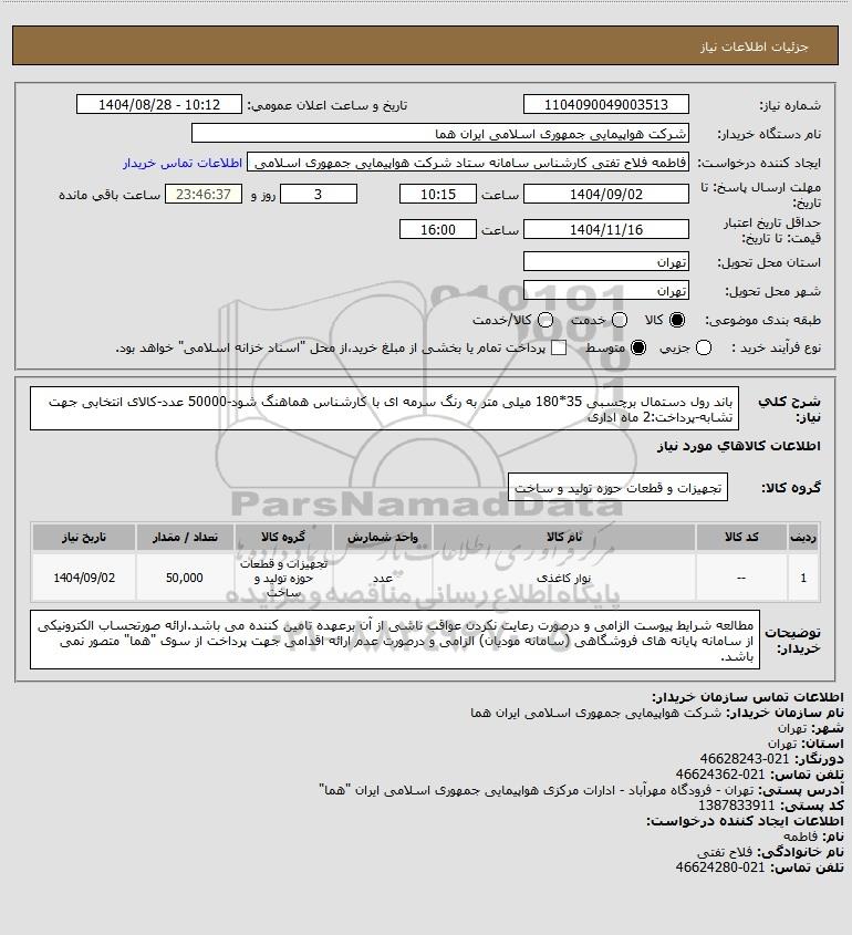 تلفن:5- 88349670 (021) فکس: 88349673 (021) Website: www.ParsNamadData.com E-mail: Info@ParsNamadData.com استعلام باند رول دستمال برچسبی 35*180 میلی متر به رنگ سرمه ای با کارشناس هماهنگ شود-50000 عدد-کالای انتخابی جهت تشابه-پرداخت:2 ماه اداری