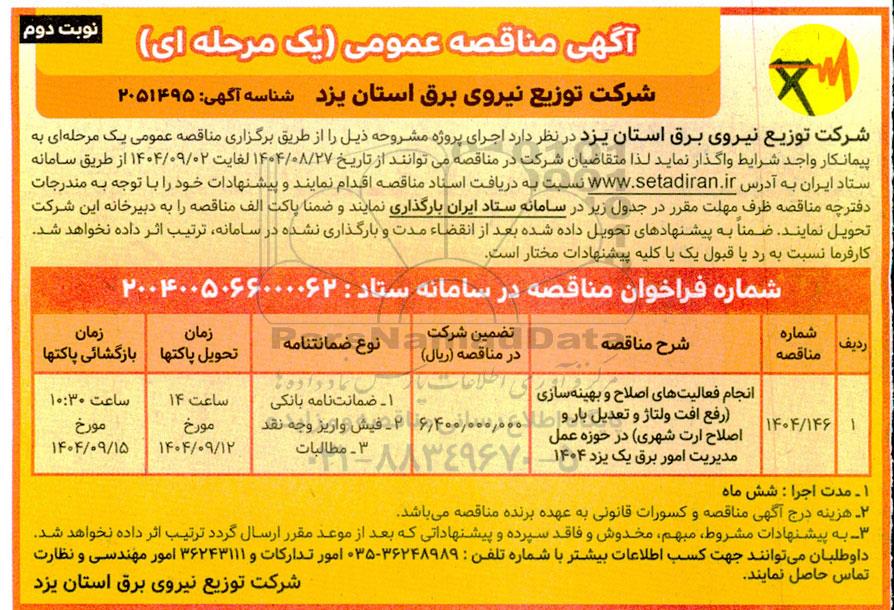 مناقصه انجام فعالیتهای اصلاح و بهینه سازی (رفع افت ولتاژ و تعدیل باز و اصلاح ارت شهری) - نوبت دوم