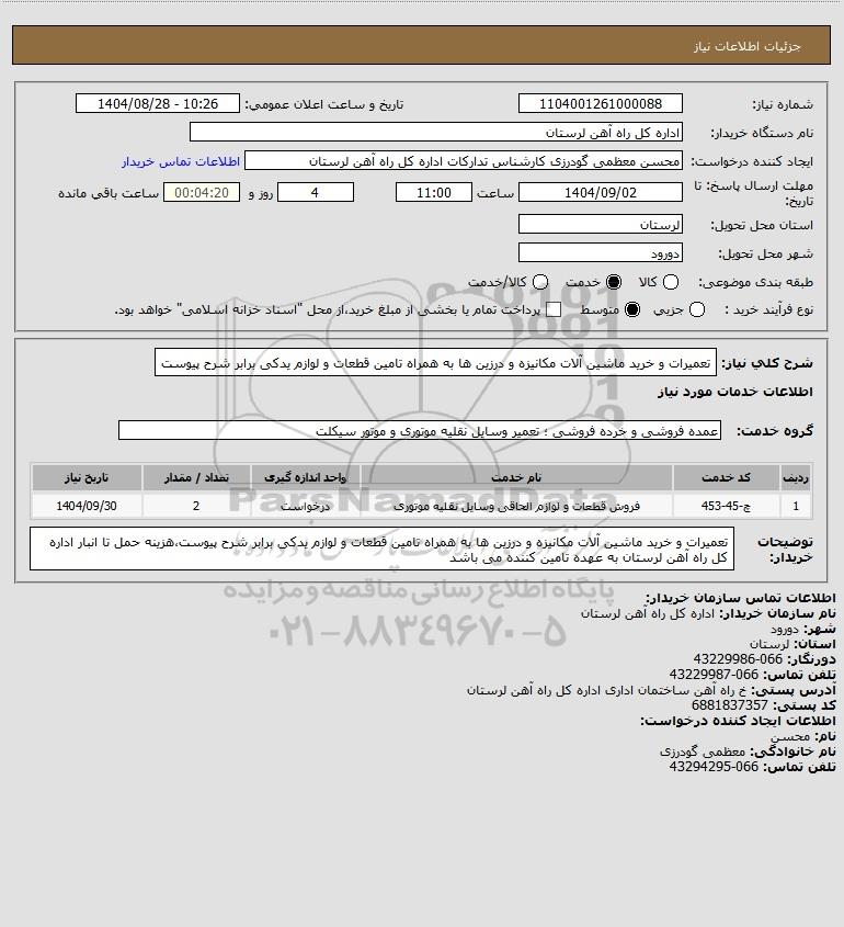 تلفن:5- 88349670 (021) فکس: 88349673 (021) Website: www.ParsNamadData.com E-mail: Info@ParsNamadData.com استعلام تعمیرات و خرید ماشین آلات مکانیزه و درزین ها به همراه تامین قطعات و لوازم یدکی برابر شرح پیوست