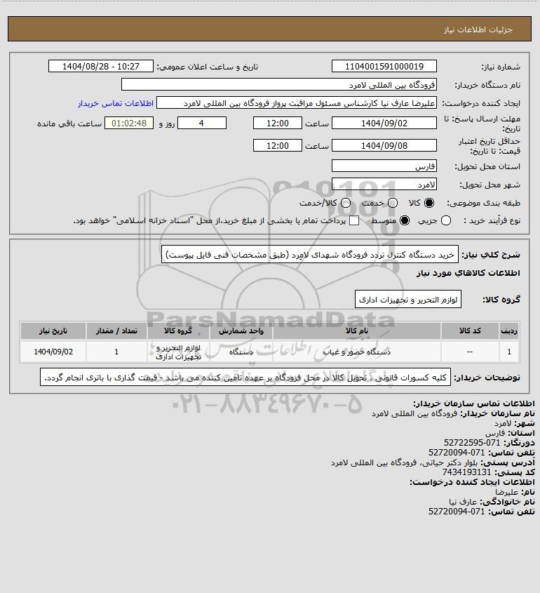 تلفن:5- 88349670 (021) فکس: 88349673 (021) Website: www.ParsNamadData.com E-mail: Info@ParsNamadData.com استعلام خرید دستگاه کنترل تردد فرودگاه شهدای لامِرد (طبق مشخصات فنی فایل پیوست)